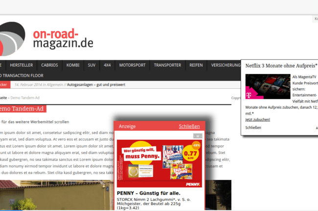 Wir mögen keine Anzeigen, die User stören. Daher haben wir Formate entwickelt, die beide Interessen -Aufmerksamkeit für den Werbekunden und Nutzbarkeit der Seite für den User- in Einklang bringt.