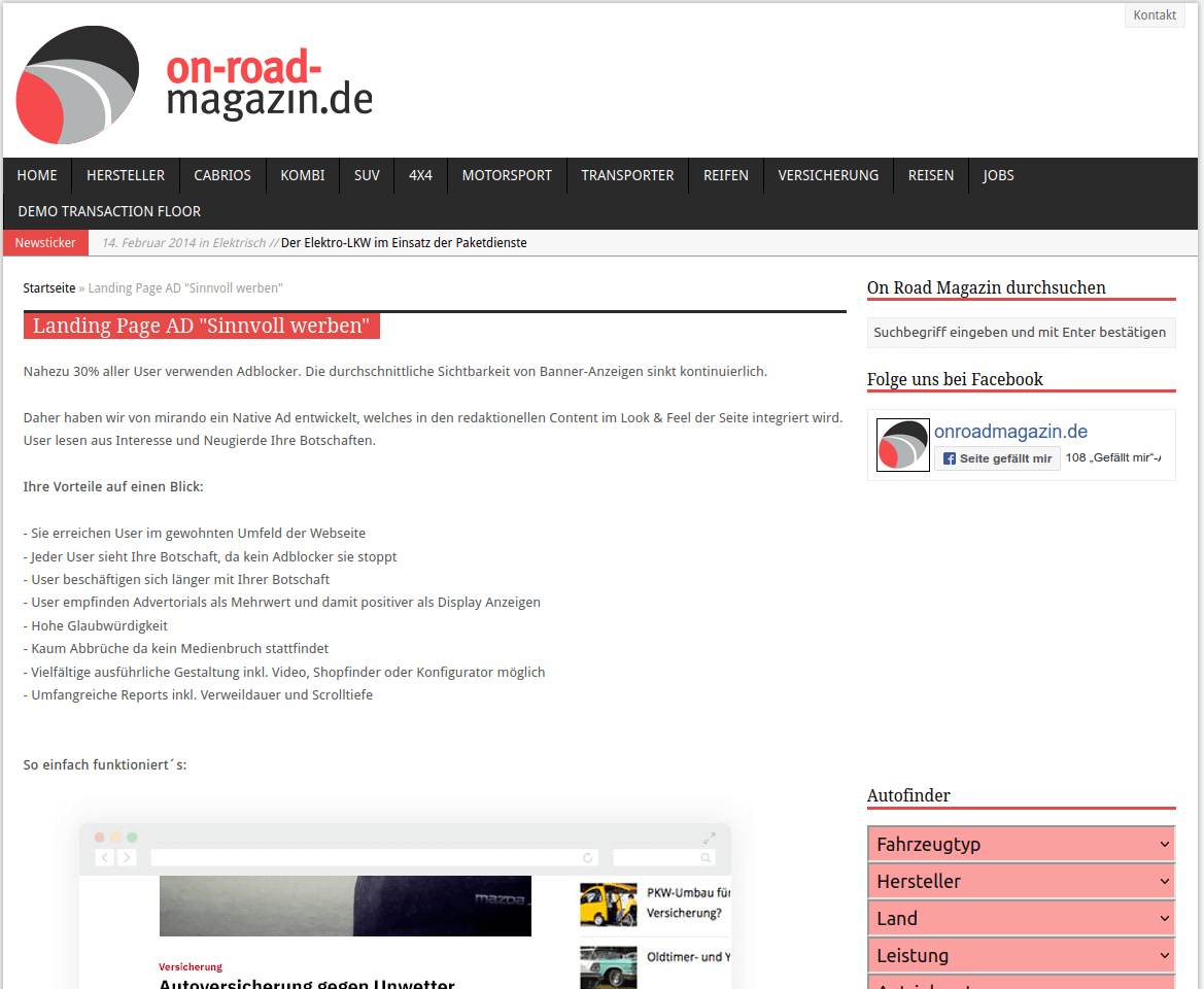 Das Advertorial wird über eine caching Methode nachgeladen und der Nutzer gelangt ohne Medienbruch bzw. ohne die Webseite zu verlassen auf den breitgesellten Text. Unser Advertorial kann neben Text- auch Bild- und Videoinhalte beinhalten. Wir führen über eine A/B Testing eine schnelle Optimierung durch. Folgende Insights können wir euch zum Beispiel zur Verfügung stellen: Verweildauer, Scrolltiefe, Klickrate.